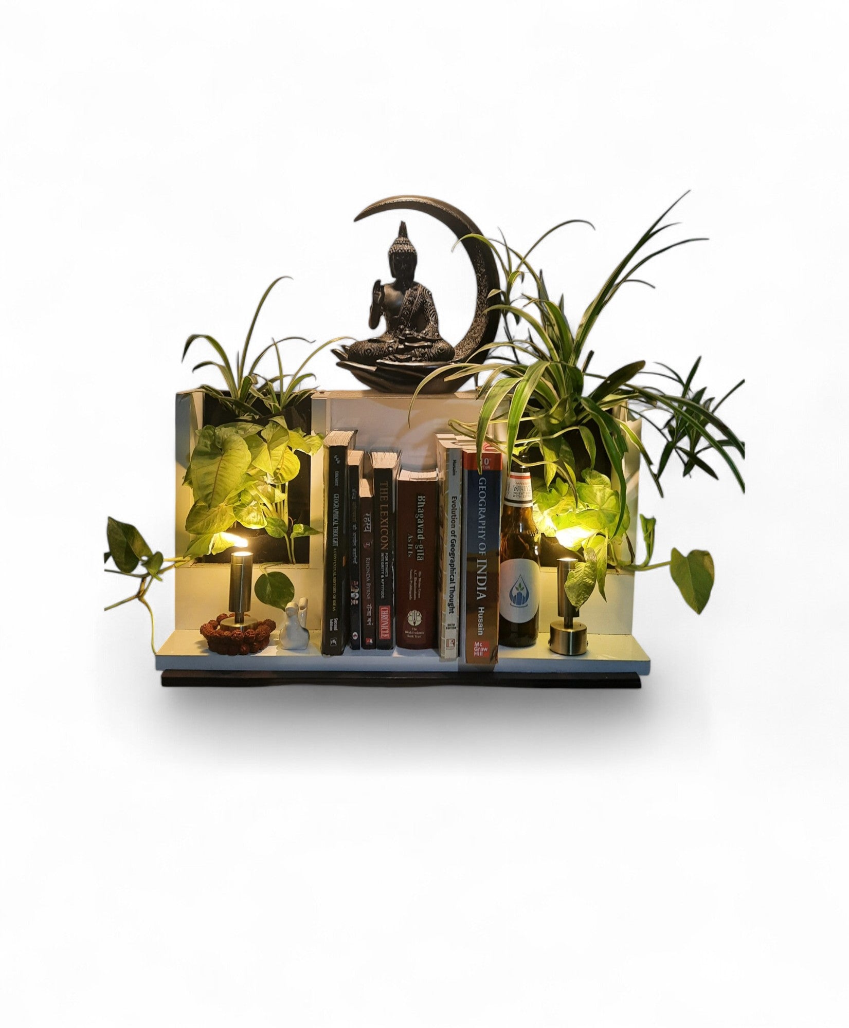 Inspired by the wisdom of ancient Nalanda, this modern bookshelf is more than just storage — it's a living statement piece. Crafted with integrated live plants, warm ambient lighting, and a sleek glass stand for showcasing your favorite décor item, the Nalanda Book Shelf brings harmony between greenery, light, and literature. Perfect for mindful homes, cozy reading corners, or modern workspaces.