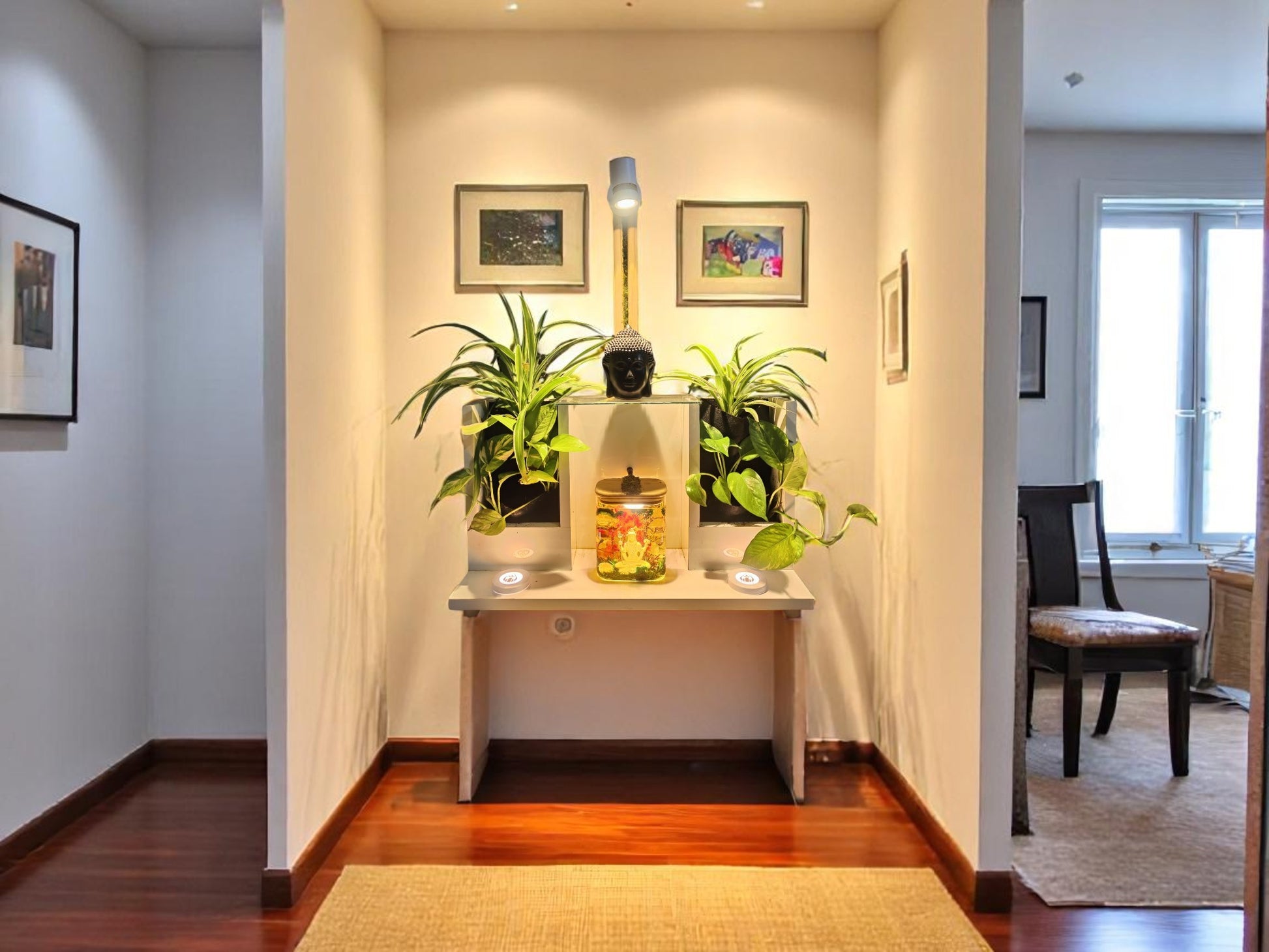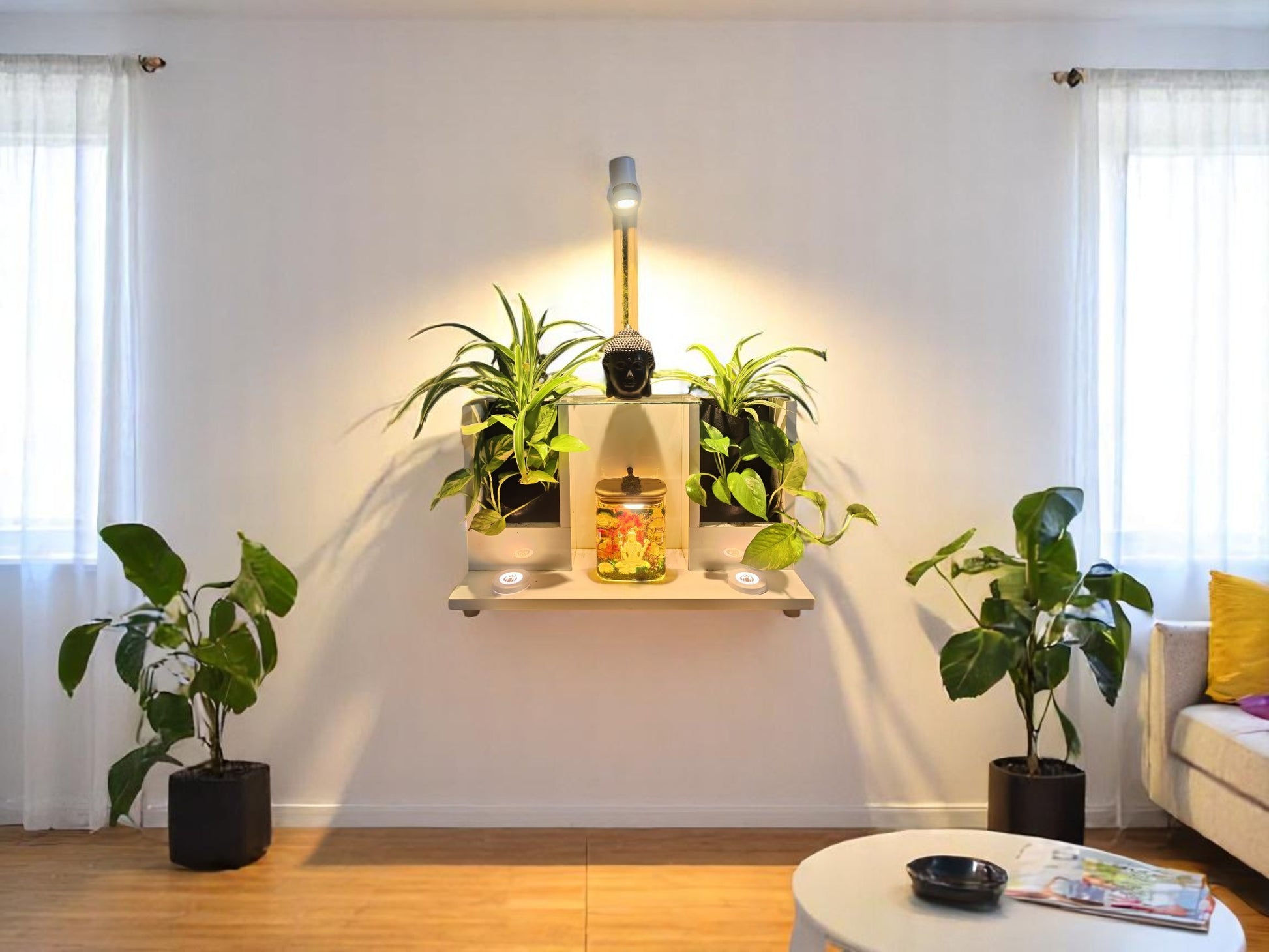 Bring tranquility and elegance into your home with Prakriti Glow, a unique fusion of nature-inspired aesthetics and mindful design. This wall-mounted living décor features two vibrant plant columns, bringing a burst of greenery and life into any space. At its heart lies the Samjyoti Lamp, crafted with twin wooden sticks and a refined spotlight that illuminates a central decor idol resting on a sleek glass shelf.